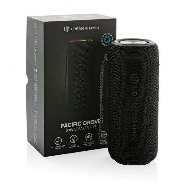 Vodeodolný IPX7 bezdrôtový reproduktor 30W. Praktické pútko a odolné prevedenie. Možnosť spárovania 2 reproduktorov pre stereo počúvanie. Počúvanie 8h na jedno nabitie. Dvojitý subwoofer pre kvalitnejší basový zážitok. Podiel recyklátu: 36%. PVC free.