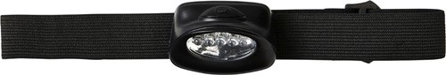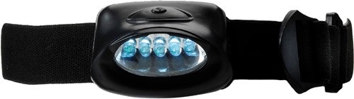 Čelová lampa (materiál: plast ABS) s 5 LED diódami v plastovom puzdre a nastaviteľným popruhom. Batérie v cene.