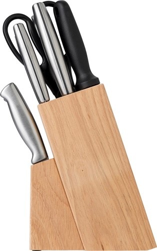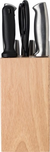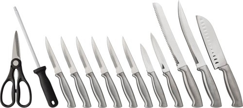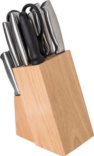 14-dielna sada nožov s rukoväťou z polypropylénu a čepeľou z nehrdzavejúcej ocele v drevenom držiaku. Súprava obsahuje nožnice, brúsič nožov a 11 nožov.