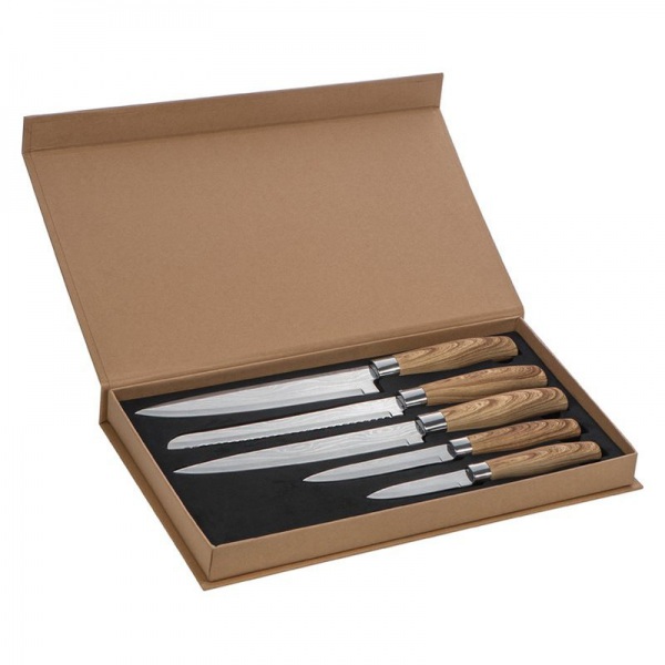 5-dielna sada nožov rôznej veľkosti, s drevenou rukoväťou a kovovou čepeľou v darčekovom balení.
