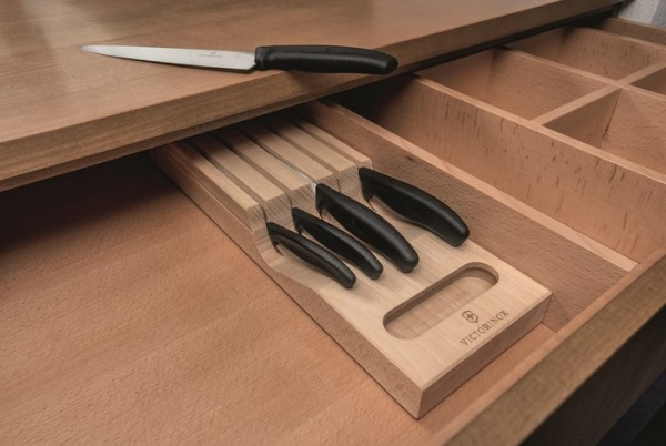 Súprava nožov v zásuvkovom stojane z bukového dreva obsahuje nôž na chlieb (21 cm), kuchársky nôž (19 cm), nôž na paradajky (11 cm), univerzálny kuchynský nôž (8 cm) a nôž santoku (17 cm). Darčekové balenie.