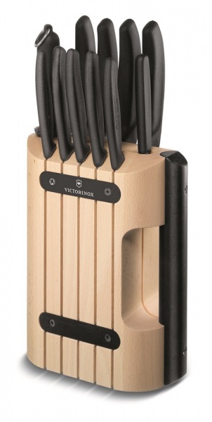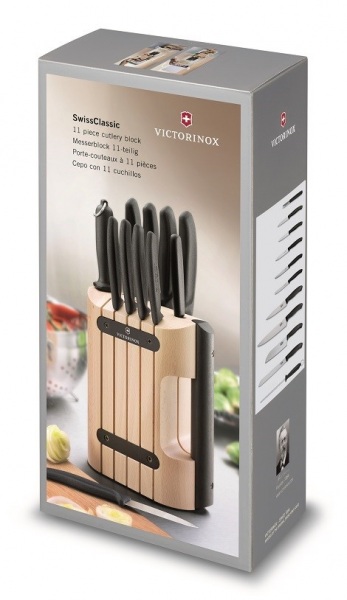 Obsahuje: škrabku na zemiaky, steakový nôž (11 cm), 3 univerzálne nôže (8 cm, 8cm a 10 cm), nôž na paradajky (11 cm), 2 kuchárske nože (15 cm a 22 cm), nôž santoku (17 cm), nôž na chlieb (21 cm) a brúsič (20 cm). Darčekové balenie.