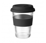 Sklenený pohárik so silikónovým viečkom a rukoväťou.