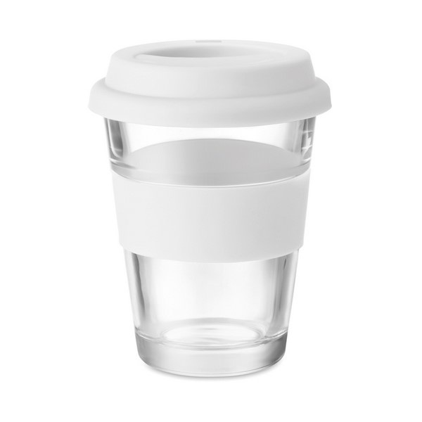 Sklenený pohárik so silikónovým viečkom a rukoväťou.