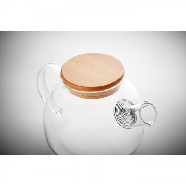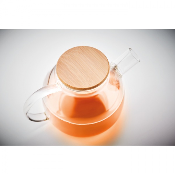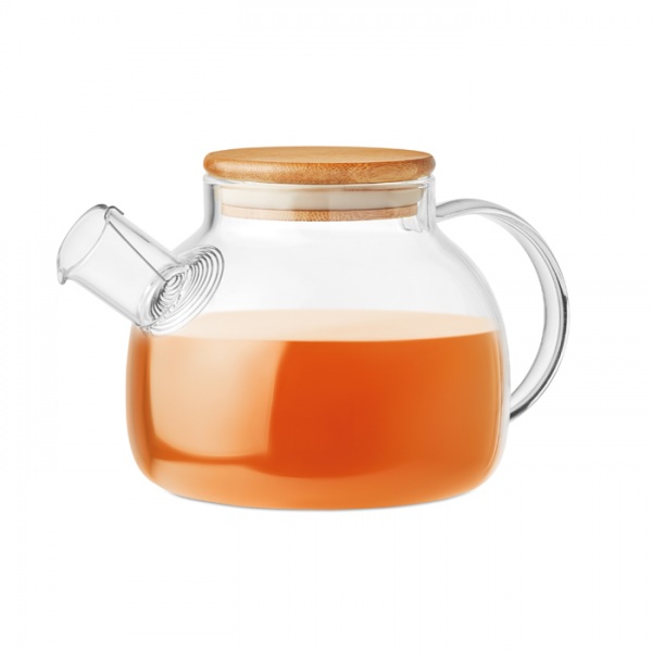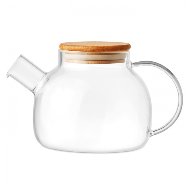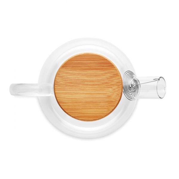 Borosilikátové sklenená kanvica so sitkom z nerezovej ocele a bambusovým viečkom. Objem 850 ml. Bambus je prírodný materiál, viečka sa môžu líšiť.