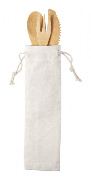 Sada 3ks príborov z bambusu v bavlnenom obale.