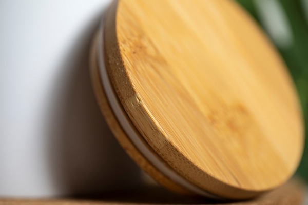 Keramický hrnček v matnom prevedení s bambusovým viečkom, 370 ml. V krabici z hrubého papiera.