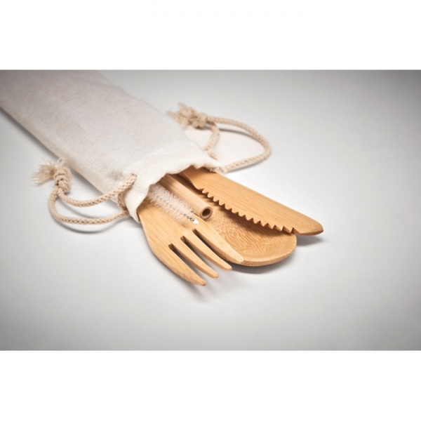 sada opakovane použiteľných bambusových príborov v plátenom puzdre. obsahuje bambusový nôž, vidličku, lyžicu, slamku a kefka z nerezovej ocele.