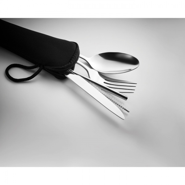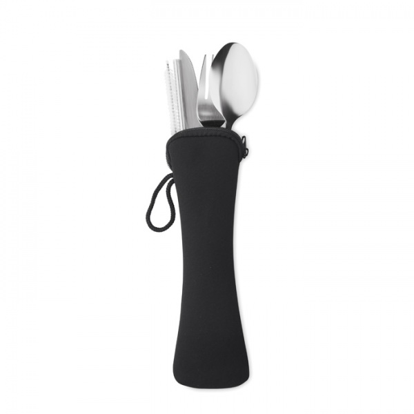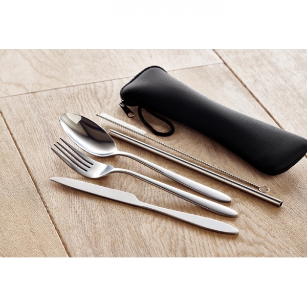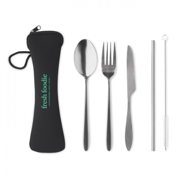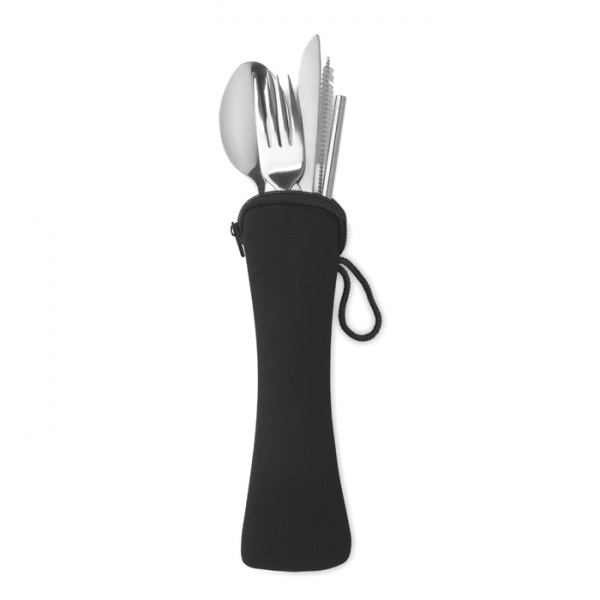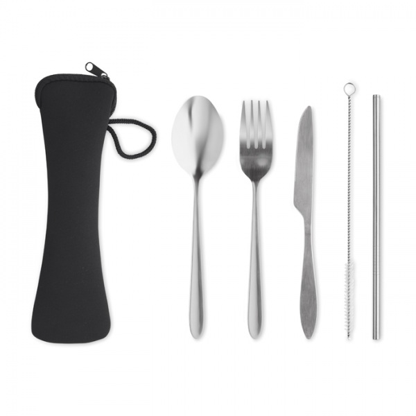 znovu použiteľné nerezové príbory. set obsahuje nôž, vidličku, lyžicu, slamku a kefku v neoprénovom puzdre.
