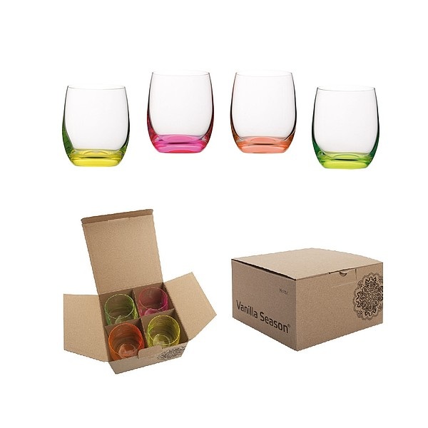 Sada štyroch pohárov s farebným neónovým tónovaním z kvalitného skla Bohemia Crystal. Sada je balená v darčekovej krabičke Vanilla Season.