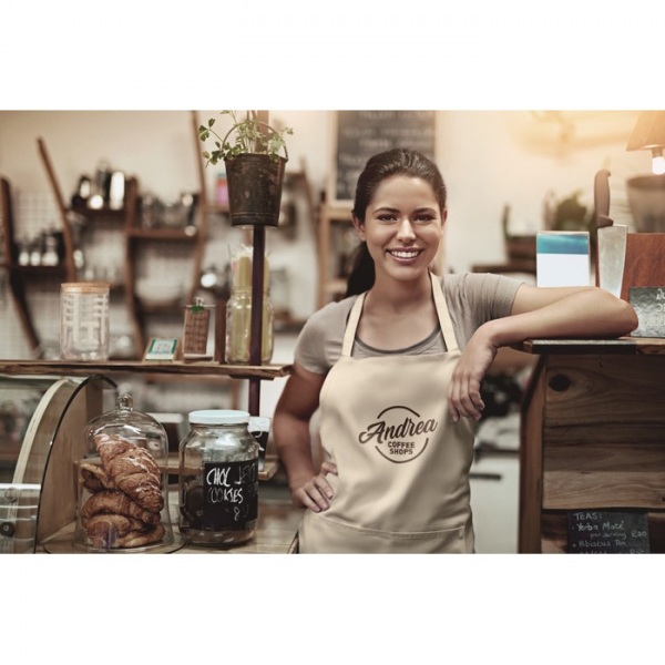 Kuchárska zástera s 2 prednými vreckami z 200 g / m? organickej bavlny. Certifikácia GOTS zaisťuje ekologicky a sociálne zodpovednú zdrojovú surovinu a výrobný proces. Vyrába sa podľa štandardu OEKO-TEX.