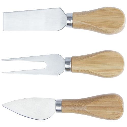 Súprava na syr z bambusu s doštičkou na syr, 2 nožmi a vidličkou. Na bočnej strane dosky na syr je magnetický prúžok na pripevnenie nástrojov.