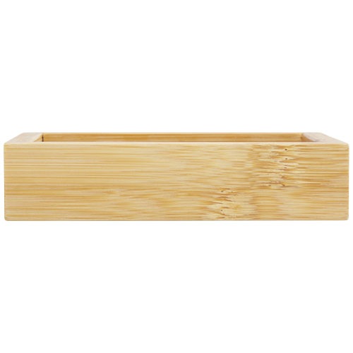 Trojdielna sada doplnkov do kúpeľa z bambusu v modernom dizajne obsahuje misku na mydlo so sitkom (11 × 8,2 × 2,4 cm), dávkovač mydla alebo pleťového mlieka (7,1 × 7,2 × 16,8 cm) a držiak na zubné kefky (8 × 8 × 11,5 cm).