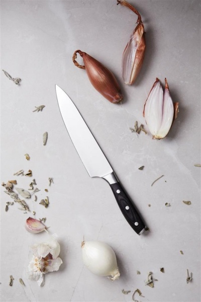 Kuchársky nôž z nemeckej ocele X50CrMoV15 s rukoväťou z dreva pakka. Vďaka ľahko uchopiteľnej rukoväti a vynikajúcemu vyváženiu čepele je práca s nožom pohodlná a jednoduchá. Veľkosť: 20 cm čepeľ.