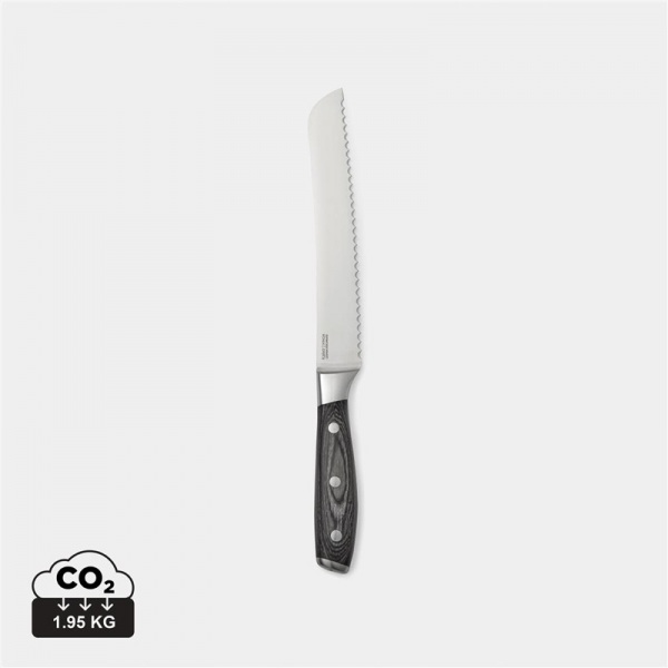 Nôž na chlieb z nemeckej ocele X50CrMoV15 s rukoväťou z dreva pakka. Vďaka ľahko uchopiteľnej rukoväti a vynikajúcemu vyváženiu čepele je práca s nožom pohodlná a jednoduchá. Veľkosť: 20 cm čepeľ.