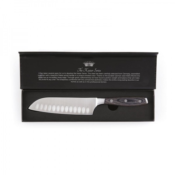 Nôž Santoku z nemeckej ocele X50CrMoV15 s rukoväťou z dreva pakka. Vďaka ľahko uchopiteľnej rukoväti a vynikajúcemu vyváženiu čepele je práca s nožom pohodlná a jednoduchá. Veľkosť: 14 cm čepeľ.