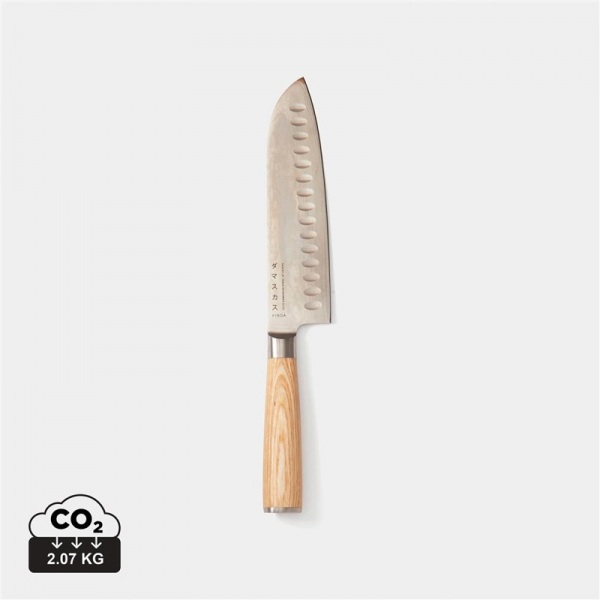 Tento nôž Santoku je ideálny na krájanie mäsa a väčšej zeleniny alebo sekanie byliniek. Robustná rukoväť z dreva pakka je ergonomicky navrhnutá. Čepeľ má úžasne tvrdé jadro z ocele VG10, ktorá je odliata zo 67 vrstiev ocele.