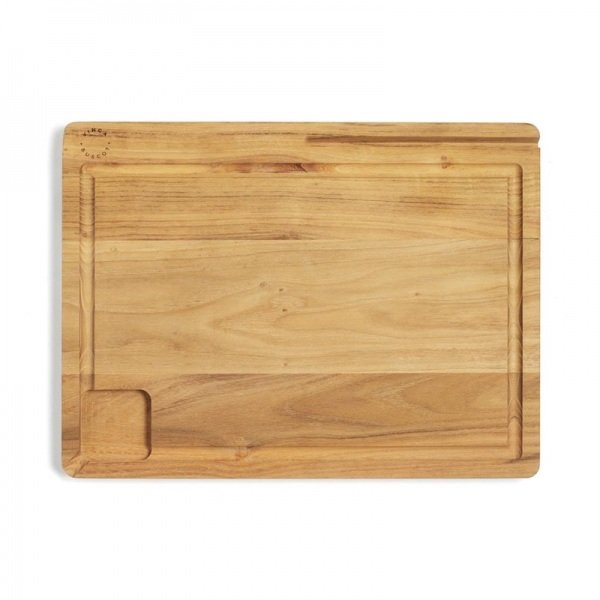 Doska je vybavená praktickým držiakom na tablet alebo mobilný telefón, takže môžete sledovať svoje obľúbené recepty online. Pozdĺž dosky na je hlboká drážka s výlevkou na zachytávanie tekutín. Je vyrobená z teakového dreva s certifikátom FSC.
