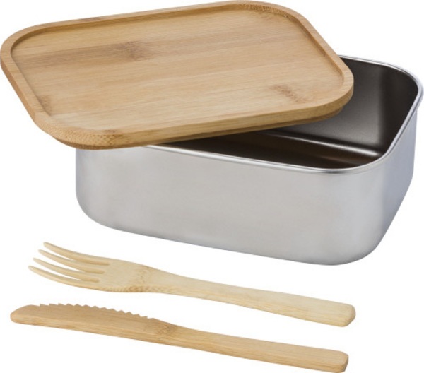 Nerezový obedár (600 ml) s bambusovým uzáverom a príborom. Vrátane nylonovej gumičky na uchytenie.