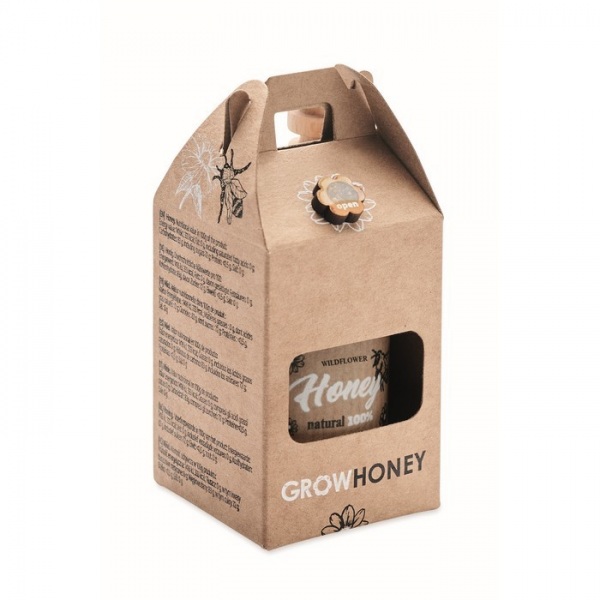 Súprava pohára medu z lúčneho kvetu (50 g) s drevenou naberačkou na med. Dodáva sa v kraftovej papierovej krabici. Vrátane semienok lúčneho kvetu. Vyrobené v EÚ.