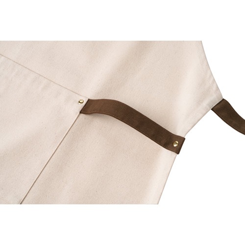 Zástera zo 100% bavlneného plátna (320 g/m?) s kovovými detailmi. S 3 multifunkčnými vreckami a bočným pásikom (na zavesenie kuchynskej utierky). Nastaviteľný popruh na krk. Dodáva sa s darčekovou krabičkou v kraftovom obale FSC