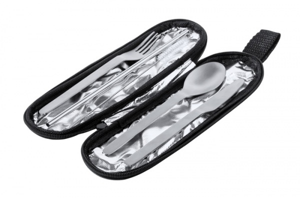 5 dielna súprava príborov z nehrdzavejúcej ocele v polyesterovom vrecku RPET. Vrátane vidličky, noža, lyžice, slamky na pitie a čistiacej kefy.