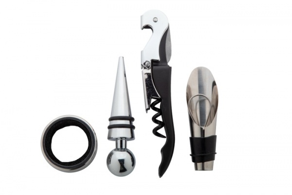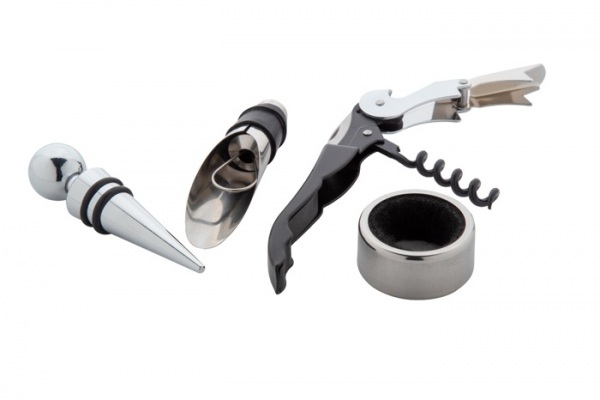 4dielna sada na víno z nerezovej ocele v krabičke v tvare knihy z recyklovaného kraftového papiera. Vrátane vývrtky, zátky, lievika a krúžku na kvapky.