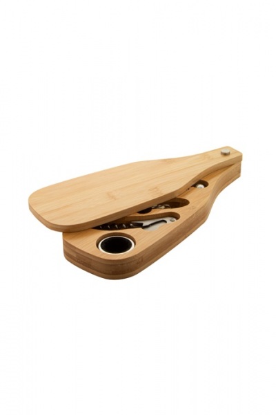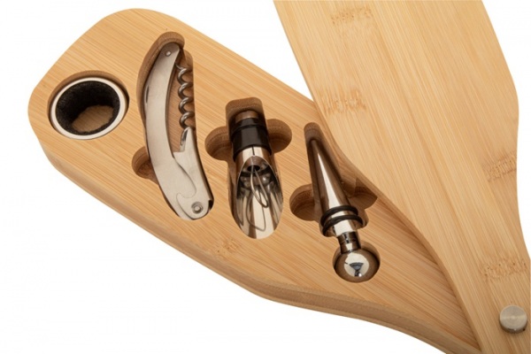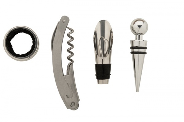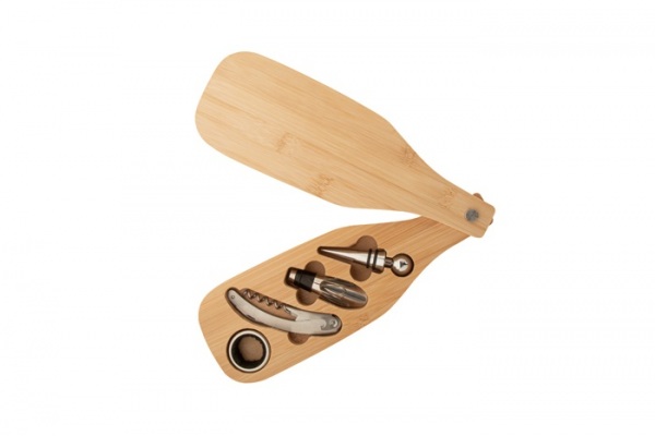 4 ks na víno z nerezovej ocele v bambusovej krabičke v tvare fľaše. Vrátane vývrtky, zátky, krúžku a lievika.
