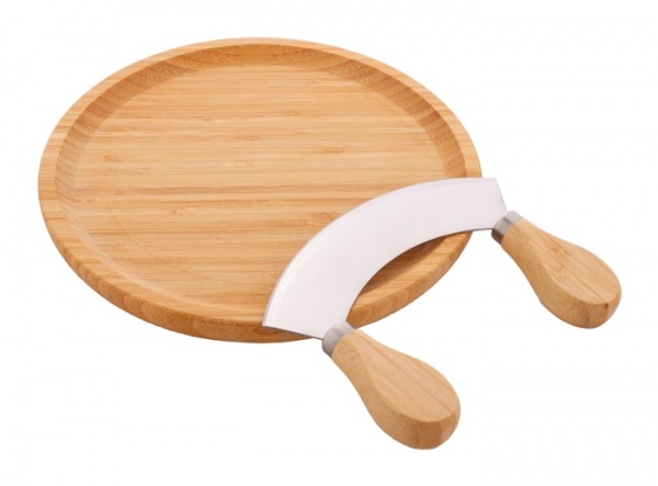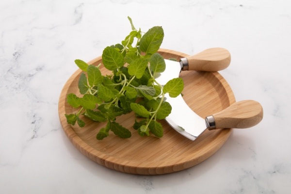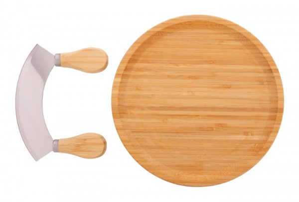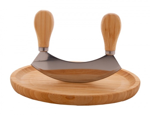 Súprava z bambusu na rezanie bylín, vrátane okrúhlej bambusovej dosky a nerezového vykrajovača na bylinky s bambusovými rukoväťami.