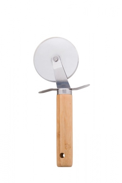 3dielna sada na servírovanie pizze z nerezovej ocele s bambusovou rukoväťou v bavlnenej taštičke so sťahovacou šnúrkou. Vrátane strúhadla na syr, krájača na pizzu a špachtle.