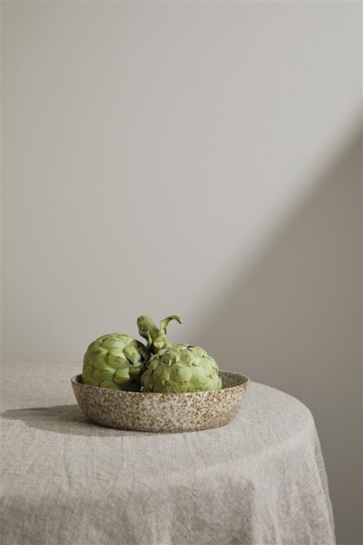 Kameninová servírovacia misa. Vďaka charakteristickým nerovným tvarom a ručnému glazovaniu je každý kus unikát. Pevná kamenina je dostatočne odolná na každodenné použitie. Riad je vhodný do umývačky riadu avšak nie je vhodný do mikrovlnky ani rúry.