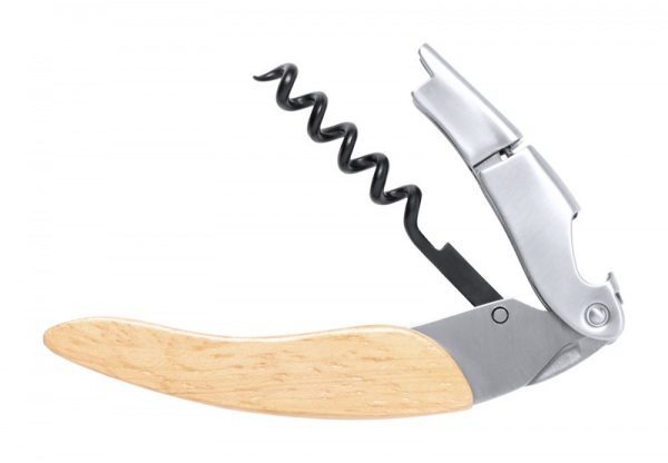 Otvárač a vývrtka z nerezovej ocele s drevenou rukoväťou.