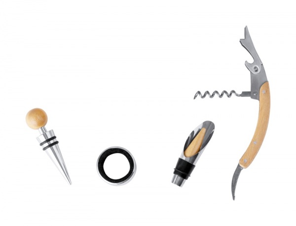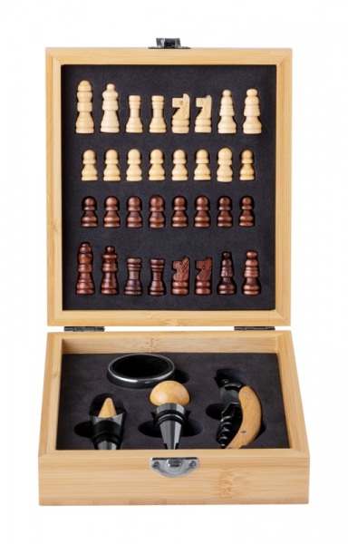 4-dielna sada na víno z nerezovej ocele s bambusovou vložkou v bambusovej krabičke so šachovnicou a 32 šachovými figúrkami. Súčasťou sú vývrtka, zátka, krúžok a rezák.