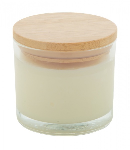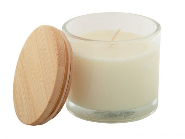 Rastlinná vosková sviečka s vôňou vanilky v sklenenom držiaku s bambusovým viečkom. S 95 gramami vosku. V kraftovej papierovej krabici.