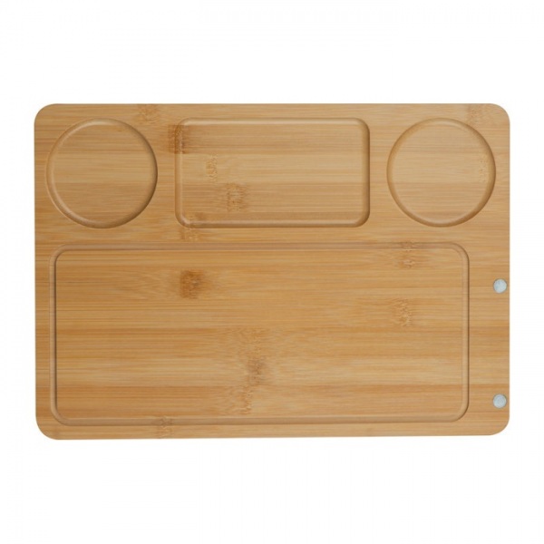 Bambusová sada na servírovanie syrov pozostávajúca z veľkého servírovacieho taniera s magnetickým držiakom na nerezové syrové príbory.