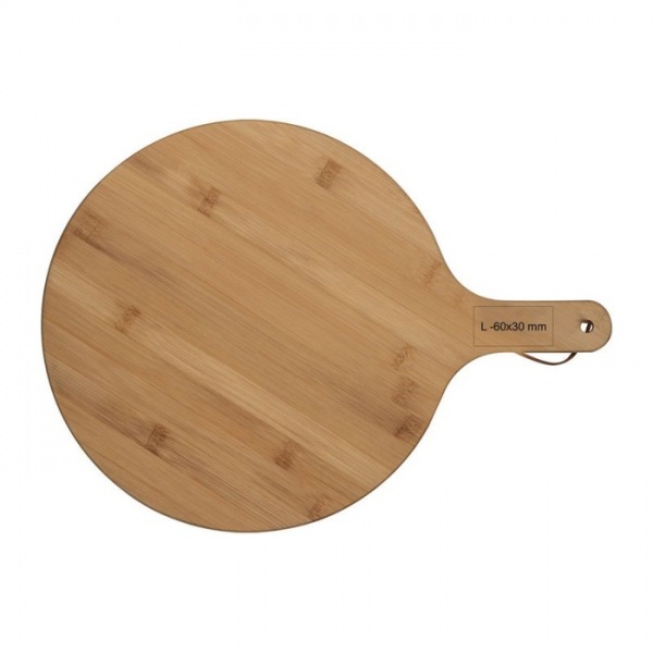 Okrúhla servírovacia doska s rukoväťou a popruhom na zaväsenie.