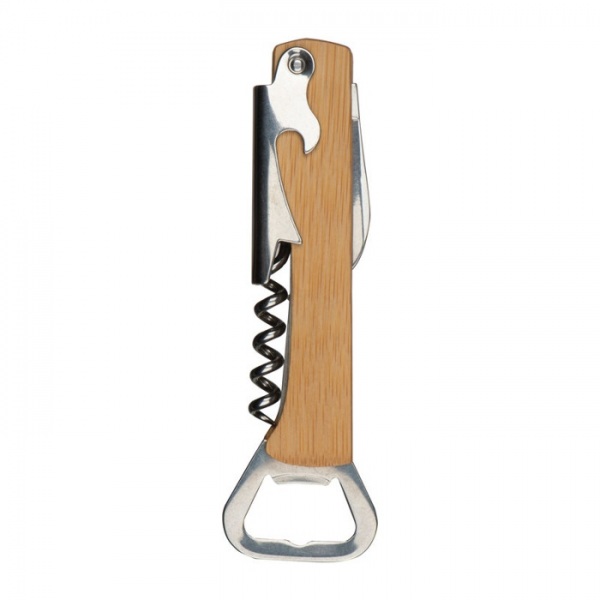 Kovový a bambusový čašnícky nôž s otváračom na fľaše, vývrtkou a rezačom fólie.