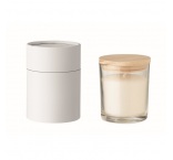 Vosková sviečka s vôňou vanilky 120 g v skle s bambusovým vrchnákom v darčekovej papierovej tube. 7 cm priemer. Doba horenia: 20 hodín. Bambus je prírodný produkt, môžu existovať mierne odchýlky vo farbe, čo môže ovplyvniť konečný výsledok potlače.