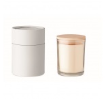 Vosková sviečka s vôňou vanilky 240g v skle s bambusovým viečkom v darčekovej papierovej krabičke. 8 cm priemer. Doba horenia: 40 hodín. Bambus je prírodný produkt, môžu existovať mierne odchýlky vo farbe, čo môže ovplyvniť konečný výsledok potlače.