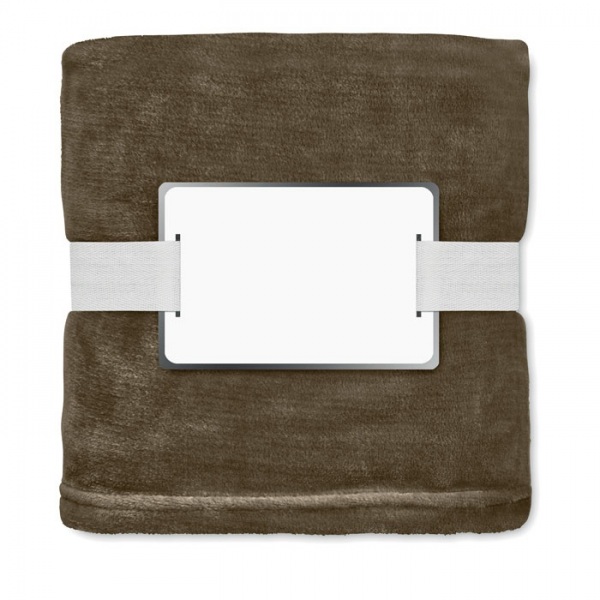 RPET flanelová flísová deka zabalená do stuhy s kartičkou pre potlač.