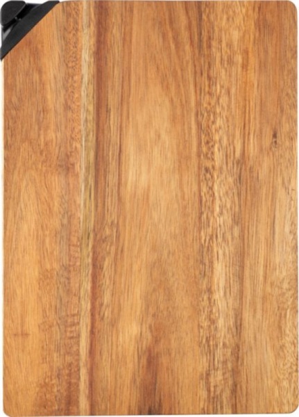 Doska na krájanie z akáciového dreva s brúskou na nože na boku. Jednotlivo balené v hnedej kartónovej krabici.