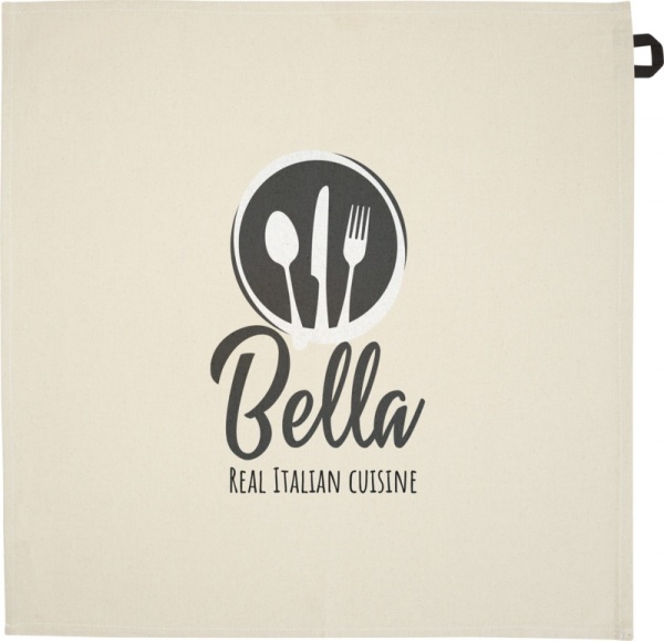 Kuchynská utierka vyrobená zo 100% recyklovanej bavlny s certifikáciou GRS o gramáži 200 g/m? s výrazným pútkom v kontrastnej farbe. Veľkosť utierky: 50 x 50 cm.