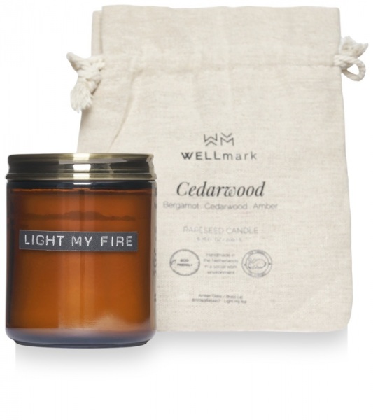 Stredne veľká sviečka s vôňou cédrového dreva v hnedom pohári s mosadzným viečkom. Vonná sviečka horí až 35 hodín a nádobu je možné po dohorení znovu použiť na iný účel. Ručne vyrobená v Holandsku zo 100% repkového vosku. Dodávané v bavlnenom sáčku.