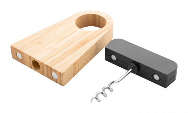 Bambusový a recyklovaný ABS držiak na víno s vývrtkou z nerezovej ocele.