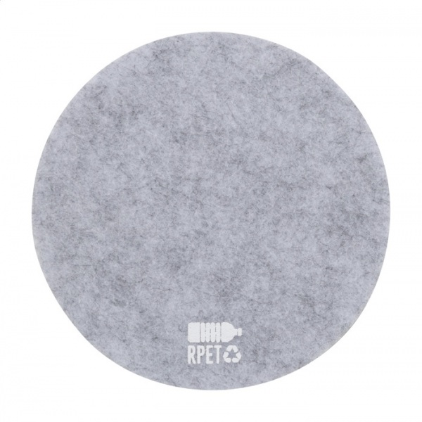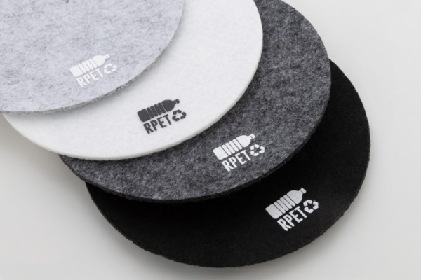 Okrúhly plstený podtácok RPET. S výrazným znakom RPET.