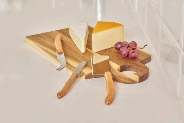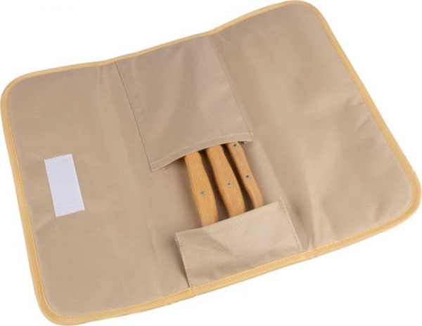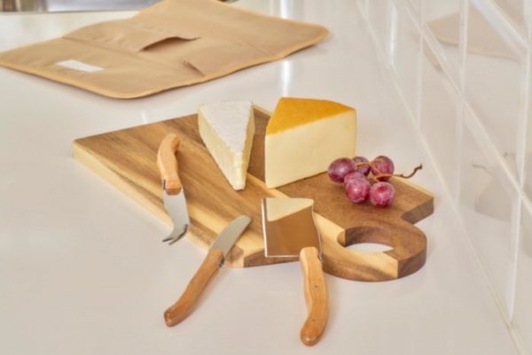 Sada nožov na syr z rPET v puzdre so suchým zipsom 600D, nože z nehrdzavejúcej ocele s drevenými rukoväťami. Vo vnútri je štítok z rPET. Bezpečné pre potraviny. Jednotlivo balené v hnedej kartónovej krabici.