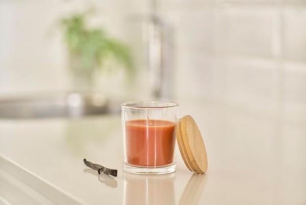 Sklenená sviečka so 120 gramami farebného vosku a vanilkovou vôňou, uložená v priehľadnej sklenenej nádobe s bambusovým viečkom. Poskytuje približne 20 hodín horenia. Jednotlivo balená v bielej kartónovej tube.