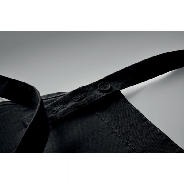 Nastaviteľná zástera s 1 veľkým predným vreckom s 2 priehradkami z organickej bavlny s gramážou 240 g/m2. S nastaviteľným gombíkom na krčnom popruhu. Tento výrobok má certifikát OEKO-TEX® STANDARD 100.