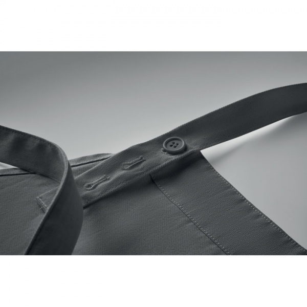 Nastaviteľná zástera s 1 veľkým predným vreckom s 2 priehradkami z organickej bavlny s gramážou 240 g/m2. S nastaviteľným gombíkom na krčnom popruhu. Tento výrobok má certifikát OEKO-TEX® STANDARD 100.
