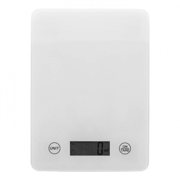 Digitálna kuchynská váha s vážiacou plošinou z tvrdeného skla a vstavanou dobíjacou batériou cez USB (200 mAh). Kapacita: 5 kg, stupnica 1 g, jednotky merania: g/oz. S indikátorom vody/mlieka ml. Vrátane nabíjacieho kábla USB.